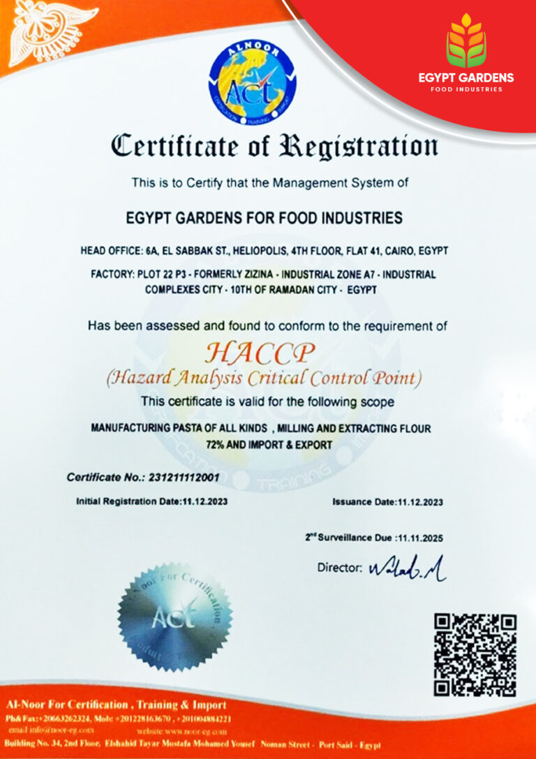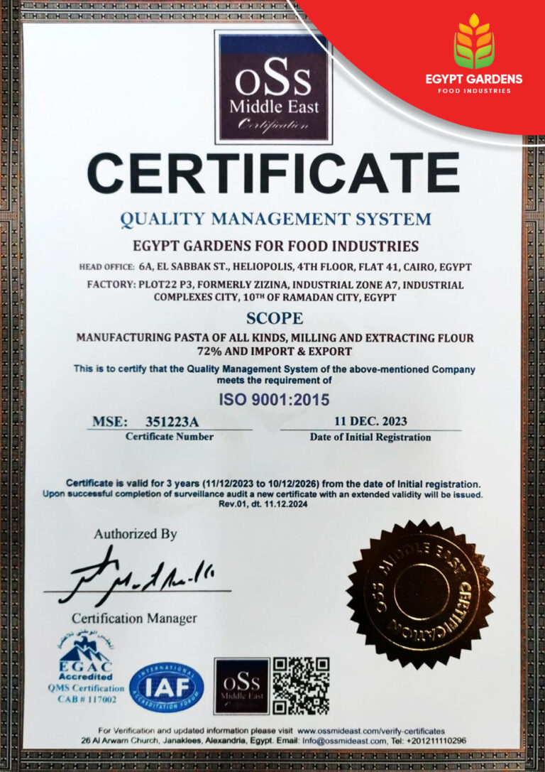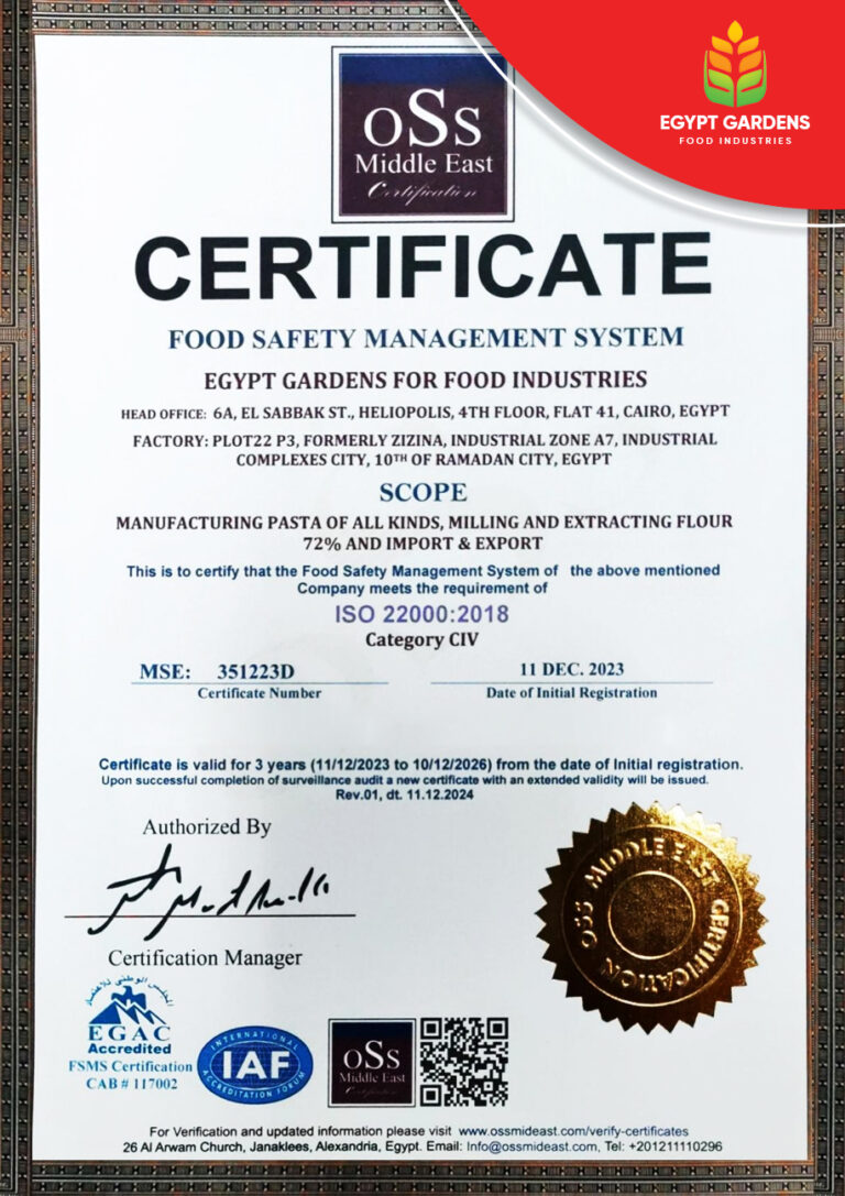 The factory is committed by following the highest safety and health standards of food production starting from the early stages of receiving the wheat shipments till the final stages of pasta packing. The factory is ISO 22000 certified (Food Safety Management System) and ISO 9001 certified (Quality Management system).