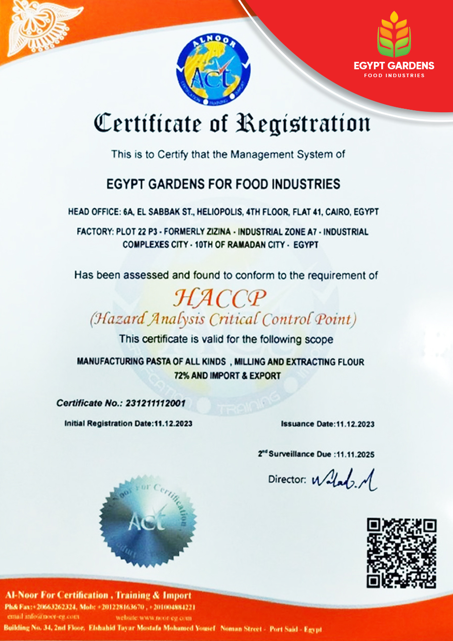 Egypt Gardens for food industries, is an Egyptian family-owned food company established in 2017. Egypt gardens, provides high quality pasta with the high-tech production lines, Swiss (BUHLER®) machines, with production capacity 3.5 tons per hour for long pasta line and a production rate of 6.5 tons per hour for short pasta line.