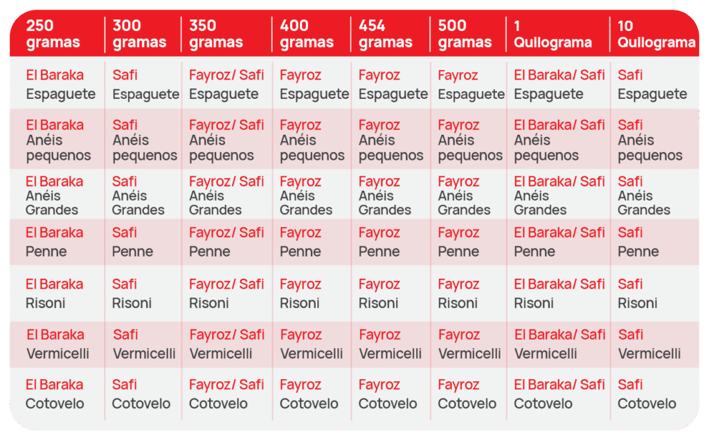 Fayroz Pasta, um produto de alta qualidade da nossa empresa, que oferece mais formatos e pesos disponíveis para cada tipo, de forma a satisfazer as necessidades dos nossos valiosos clientes.